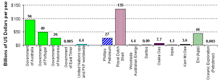 | Where based: Britain/Netherlands Year founded: 1890 Number of employees: 91,000 Assets: $183,000 Revenues: $135,000 Profits: $12,000 Where do they get oil and gas?: 41 countries, including Nigeria, Brunei, Colombia, Malaysia, Gabon, Philippines Reserves worldwide (P): 19,100 Reserves in Timor Sea (2P): 1,350 Timor Sea part of reserves: 3% |