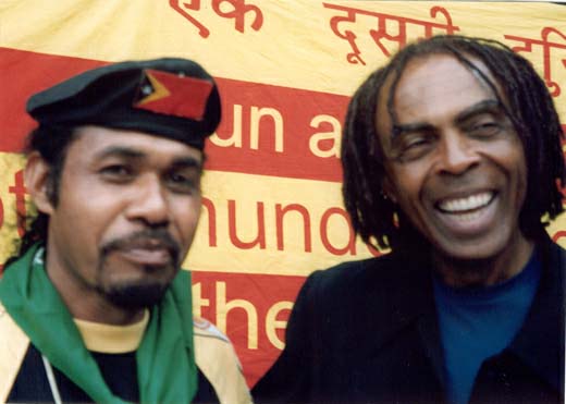 | Ego Lemos of East Timor’s New Cinco do Oriente and HASATIL with Gilberto Gil, Brazil’s Minister of Culture, at the World Social Forum. |